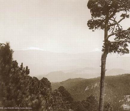Los volcanes Popocatépetl e Ixtaccíhuatl vistos desde San Miguel, >1923; IAI
